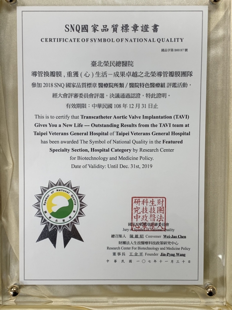 2019 年一月由臺北榮總心臟內外科主導醫師陳嬰華醫師、張效煌醫師主持的導管瓣膜團隊執行的『TAVI經導管主動脈瓣膜植入術』榮獲SNQ國家醫療品質標章。 這個團隊是全台灣執行此項突破性創新手術的第一家醫院。二位醫師多年手術經驗豐富,現也都受聘於位導管瓣膜手術國際指導醫師。多次前往國內外各大醫院進行教學指導,累積到現在,已有十多家以上的醫院接受過指導及訓練。所帶領的導管瓣膜團隊成功完成全台灣唯一的衛生署人體試驗計劃,手術成果在心臟內外科團隊合作之下,更優於歐美之結果,這些一等一的手術結果,都有發表在國際期刊之上。