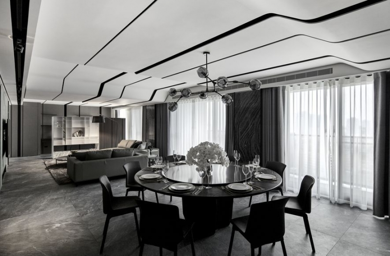 自然光成為視覺的嚮導,亦牽引我們的行進路線。方移步入室,天花板的微伏曲線便掠去訪客心神,僅賸下日光與波紋纏繞的影跡在空間中緩緩推移;特別選用的白色板材,亦使長達13米的長幅天花板,看上去更為輕盈、柔和。為平衡綻放如雲的場景漂浮感,設計師在兩側以黑灰紋路的大理石牆收束逸散氛圍,將水平視點重新聚焦回垂直立面,再次刷新賓客的心境與感受。