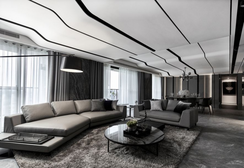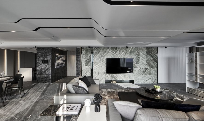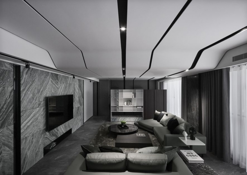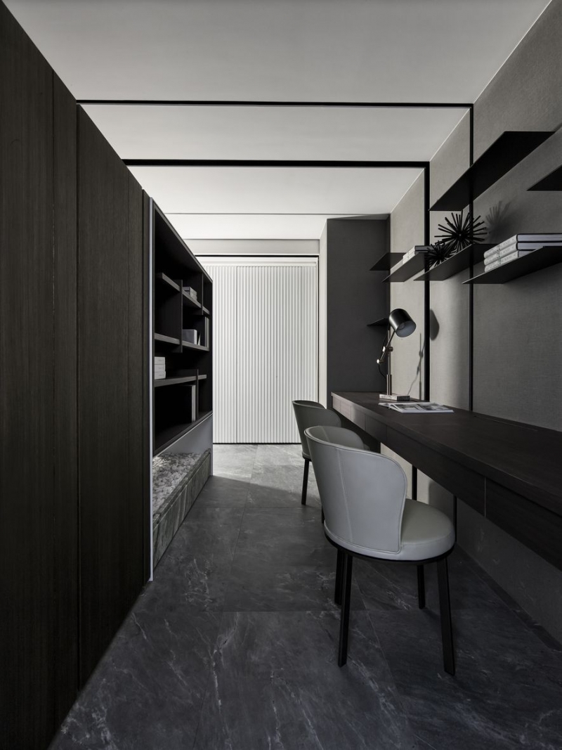 光影、流紋,自四面八方展開,浮游的線條拉至端點兩側,端景之一的書房牆面,承接了天花線條後,發展出直降至底的安排。書房前端安置一純白鐵件書架,其縱橫切割,依著美好比例行進,以伺光影傾注於此。端景,作為家中視覺停駐之點,亦是引渡至其他介面的轉緩,例如進入視聽室的線性暗門,亦以白色作為牆面延續,使視覺不生斷裂之感外,更供紋路變化的不同興味。