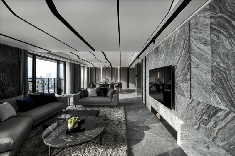 客廳主牆如蒙德里安之畫,以非對等比例分割拼裝;其沉積紋路亦隨置放角度隨意流淌,如蘸上墨跡的宣紙隨時序推衍,逐漸渲染出住家獨有的意境。對應臨窗的石牆柱列,大開窗門間歇序列,與席地展延的黑灰石地板,需互以扶持、薄厚交替,才得以為住所凝鍊出主調安靜但變化度不沉寂的氛圍。