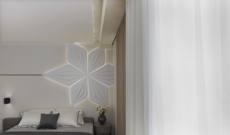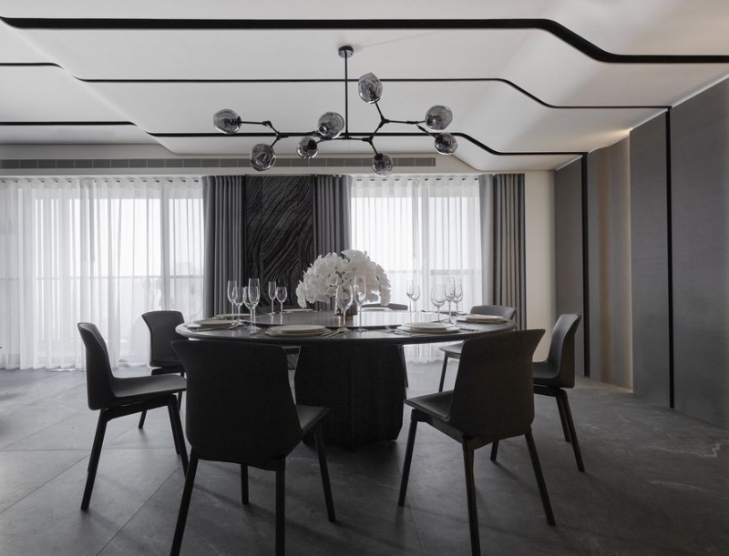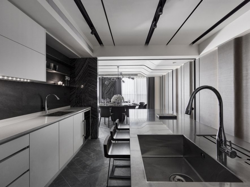 另一側餐廳牆面依循天花板線條分割,或隆起或陷入,牆與門在韻律起伏中相互掩映,以燈帶為界由實轉虛,為跨入私領域留下轉圜的餘地。離了餐桌,橫過起伏雲海,輕食吧台以一小型汀州姿態乍現,後方人造石檯面的人為素凈感與大理石微瑕的灰白質地替空間樹起包容典範;透過質材的不斷轉換,一種帶序列層次的美感昭然若揭,在比例精準地拿捏之下,一室有敞開、幽謐與轉折的多重變奏。空間得以串聯,不再被分割成一個個獨立而無關的區塊;由徐行於室的過程中,逐漸感知居室空間內點線面的鏈結關係。