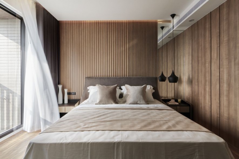 綜觀私人臥室,每間各有調性地形制其中,依著光線做床位的配置;主臥大片木色垂臨,暖調繾綣,間接光源點綴其中;在刻花造型的床頭板與天花夾縫,以及垂吊燈處等,各潛伏溫色微光,為疲憊毛躁的心靈供給源源不斷的暖意。