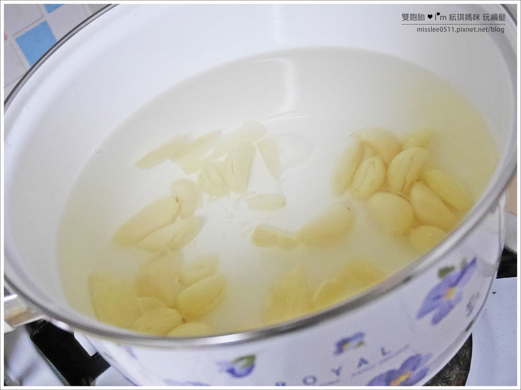 然後蒜頭去殼,約莫放個二十多顆,然後鍋內倒入適量的水。