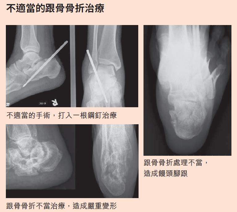 多數的跟骨骨折都是粉碎性骨折,而且還會造成距下關節的崩塌,所以在先進國家跟骨距下關節塌陷骨折的標準做法,就是採開放性復位、鋼板內固定,以期恢復跟骨的形狀及關節的活動度。但台灣大部份未受過足踝專科訓練的醫師,他們的標準做法是:打兩根鋼釘進去,「喬一喬」就好了!問題是:這些患者的距下關節都已經碎裂,光插根鋼釘進去,又怎能讓跟骨恢復原有的形狀?於是,考量若輕易施行不熟悉的足踝復位手術,可能引起併發症的風險更高,相對地,跟骨未完全復位所導致的後遺症則屬慢性,長期下來才會引發,一時之間也不會來煩醫生。所以就這樣囉!反正複雜的足踝復位手術和鋼針法的健保給付點數都一樣,都只有膝人工關節的四分之一。