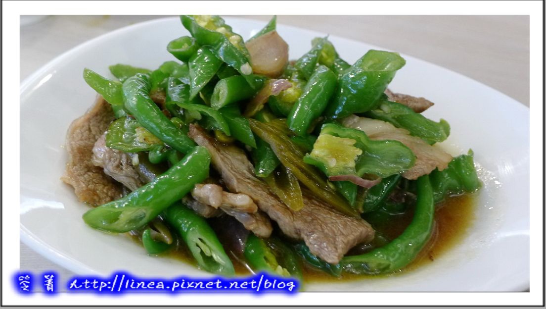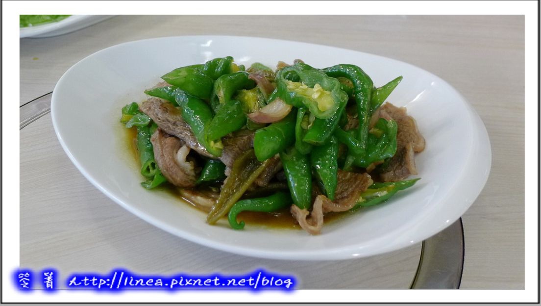 但是第三道菜跟著上桌,我們都有吃辣,所以點了些微辣的青菜,這個名字很特別,叫「雙椒炒牛小排」,這是店家推薦,雙椒是糯米椒與剝皮辣椒,兩種層次的辣感,但其實沒很辣,微微的,而那個牛小排就有來頭了……美國CHOICE牛小排。
