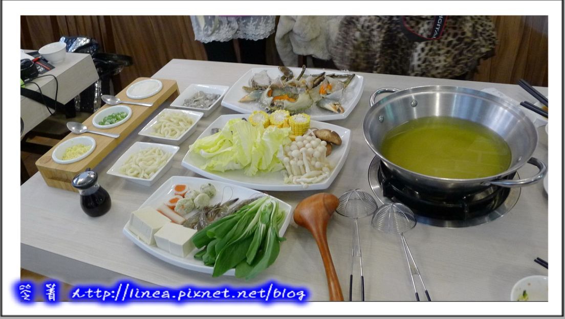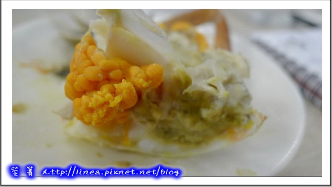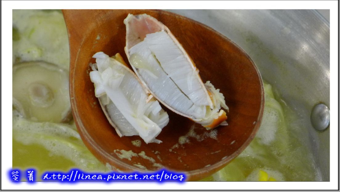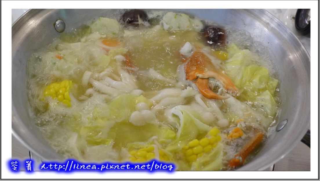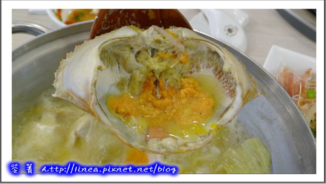 收拾一下桌面,火鍋登場囉,主要的重頭戲當然是那隻沙母囉!看看那豔橘色的蟹黃,口水…… ̄¬ ̄