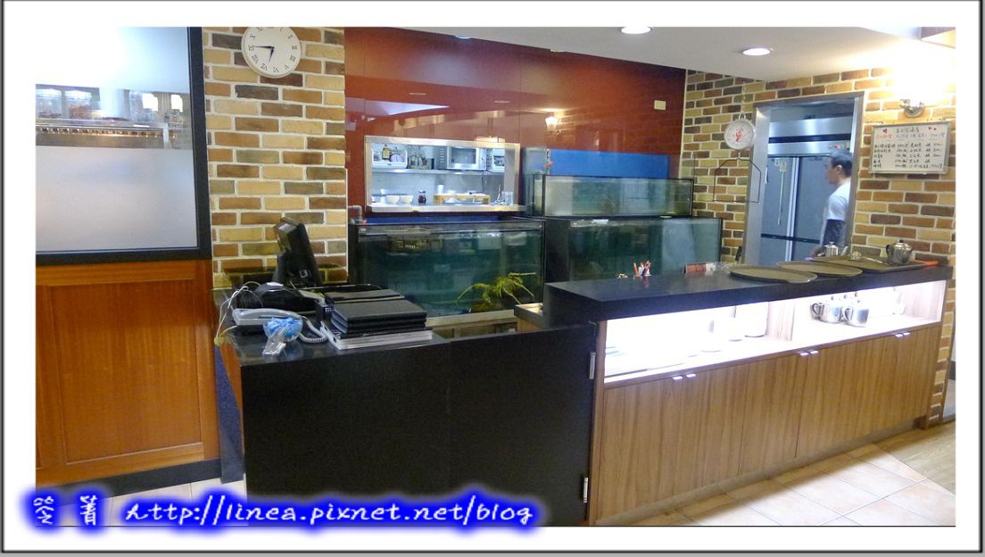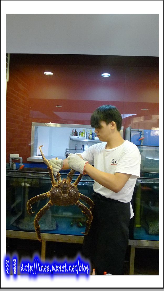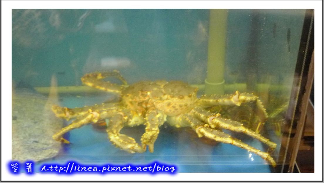 櫃檯後有著海水缸,還沒靠近就看到一隻超大的帝王蟹在Say Hello,活的帝王蟹耶,看起來超好吃的,實在比我看過的都大隻,偷偷問了老闆,老闆說那隻至少六斤重呢!