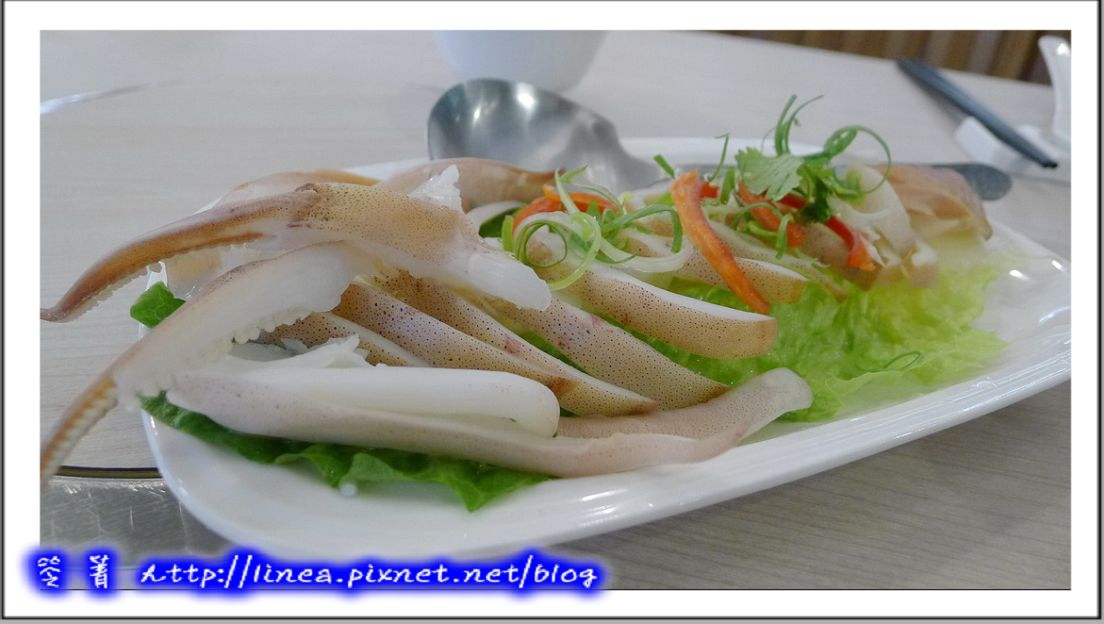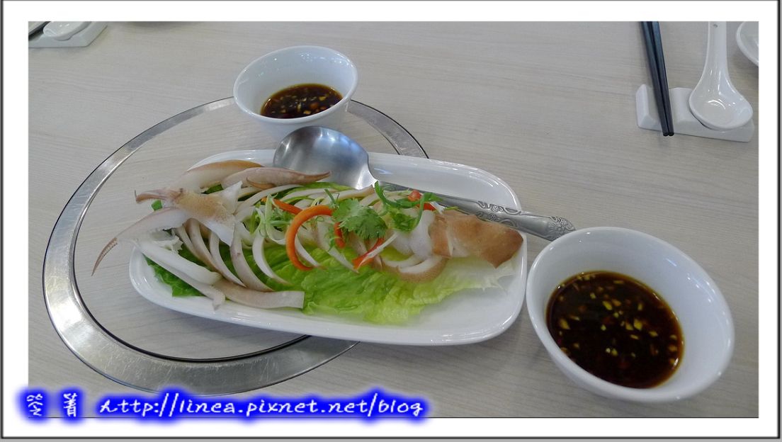 首先來道簡單的澎湖冰卷,這個冰卷是一打撈上來後,即刻在船上洗淨除去肚內臟,在煮好用急速冰鎮冷凍,目的是為了全面鎖住小卷的甜鮮,而且冰過後的小卷都脆脆的喔,還有點透明感,搭上店家搭配的獨門醬汁,更是一絕!