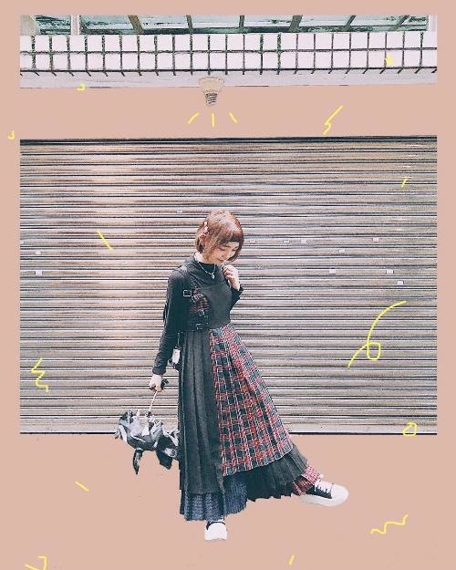 上身及下身都以格紋拼接打造整體,不過因為都選用暗色系的關係,使這身 OOTD 即便穿上裙子也很有性格。