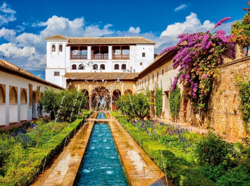 最初的古老堡壘位在達羅河(Darro River)左岸的山頂上,後來成為阿爾罕布拉宮的核心,引河水灌溉宮殿的美麗花園。這座宮殿是公認西方世界伊斯蘭建築的最高成就,多虧兩個世紀以來多位納斯瑞德王朝的君主,舊堡壘周圍逐漸有了新的建築物。每位君主都認為,牆上的每一塊空間都必須填滿裝飾,無論多小的空間都一樣,必須有讚美安拉的書法和宮廷詩人的詩句。