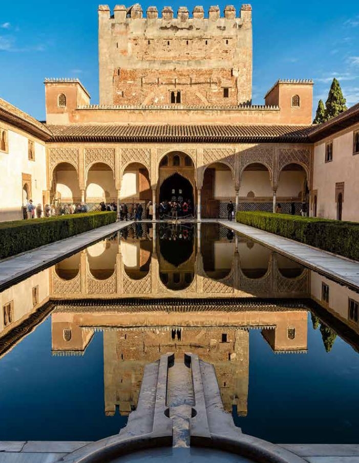 精美又雄偉的格馬雷斯宮(Comares Palace)倒映在桃金孃中庭的池塘中,中庭的名字取自這裡茂盛的桃金孃灌叢。