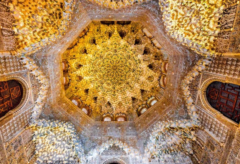 阿本莎拉赫廳中令人瞠目結舌的天花板,繁複的蜂巢拱頂由灰泥雕刻而成5000個小壁龕組成,這個房間是後宮的一部分,可通往許多凹室。