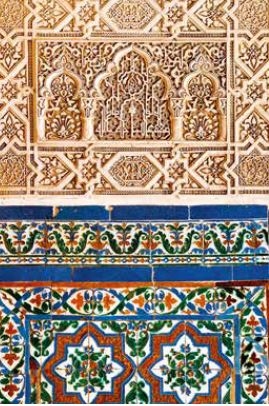 他們還在建築物上添加各種裝飾性的幾何圖案和花卉元素,有些刻在石頭或木頭上,有些用石膏塑形或是畫在彩繪磁磚上,並延伸到牆壁、天花板、拱門和柱子上,其中大部分只有美學功能。