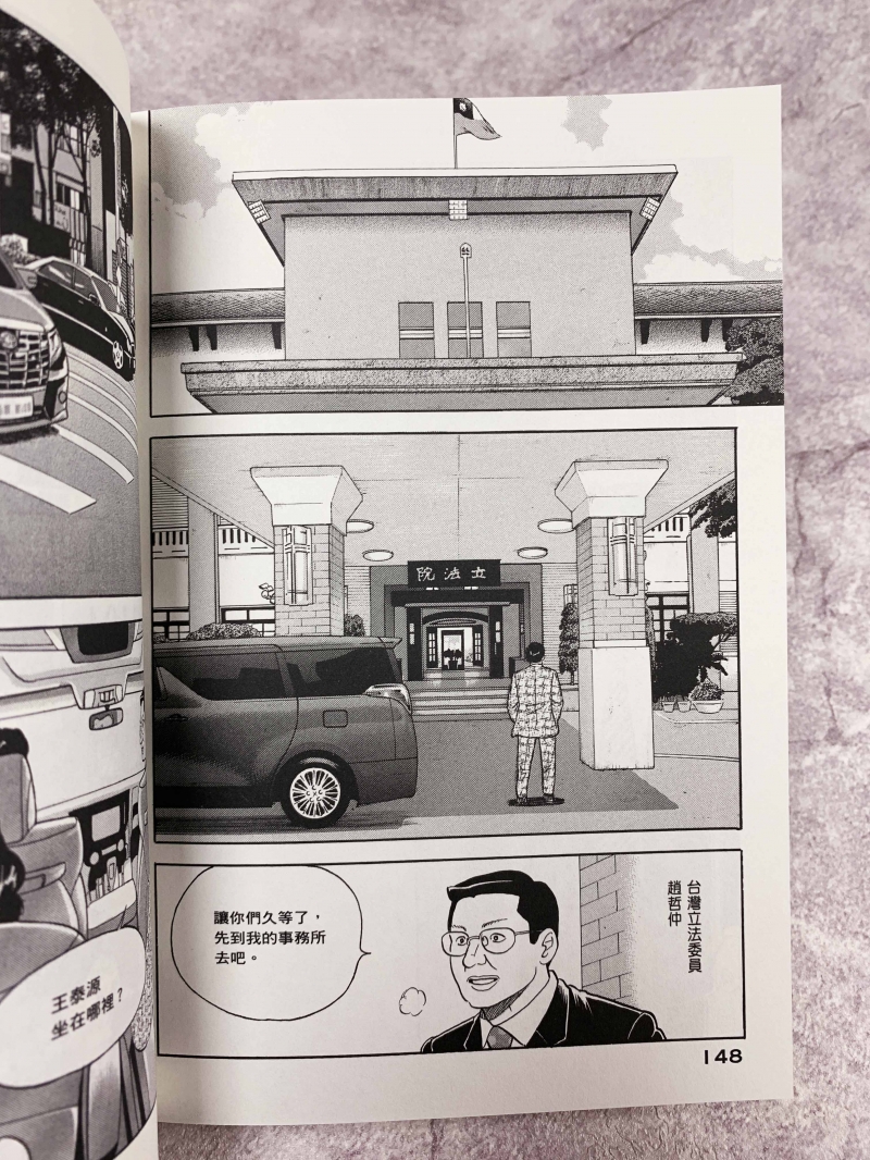 ▲為弘兼憲史提供許多政治生態分享的立委趙天麟也化身「趙哲仲」一角出現在漫畫裡(左) 除了政要機關外,漫畫裡也有眾多臺灣知名景點,如饒河街觀光夜市(下)