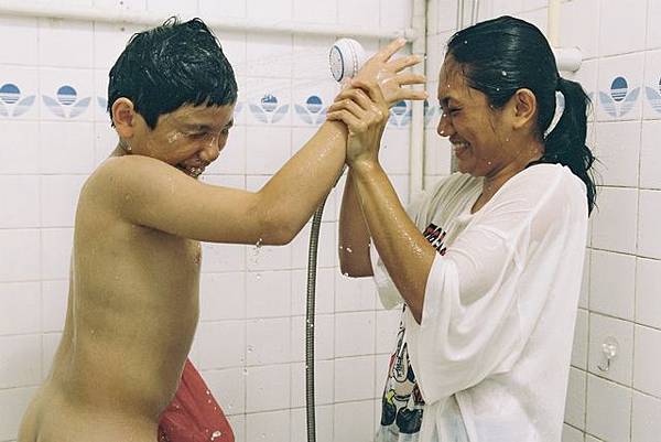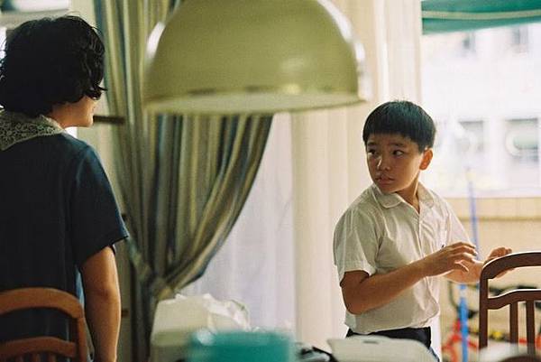 然後家樂突然又有了一個人在家裡陪伴他(之前是阿公),雖然不是家人但是會幫他洗澡陪他睡覺(儘管一開始他極為排斥),在電影裡面你或許會覺得他們感情變好的速度太快了一點,但是在真實人生之中,他們一起生活的時間更久。菲傭離開時,導演12歲,12歲,說大不大說小不小,從幾場菲傭幫家樂洗澡的戲裡頭可以看見隱隱約約家樂被性啟蒙的氣氛,若有似無、晦澀又奇妙,在一個男孩即將變成男人的過程之中,除了母親與姐妹的角色其實很少會有女性能夠一路相伴的,但傭人這個身份卻能夠滿足這個男生所有的需求,女傭泰瑞沙是家樂的母親、是他的姐妹,甚至是小男孩不渝的女伴。