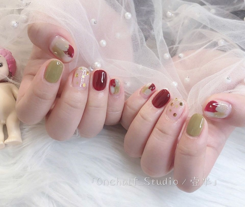 大家都說紅配綠狗臭屁,穿衣服我們也會盡量避免這兩個色同時出現,但春天這樣搭其實很合理!將明度都降低,搭起來就像是「抹茶紅豆」超級無敵可愛,且不必填滿全部的指甲,適當留白就變得很有質感。