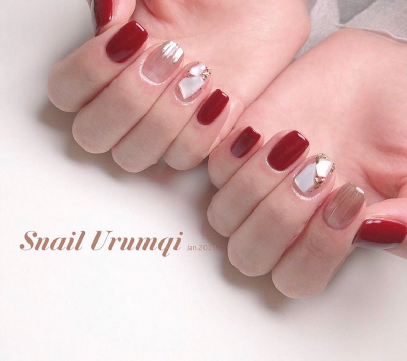 春天紅色美甲推薦5. 寶石/幾何點綴,質感大人系