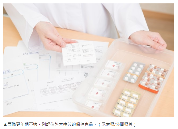 以更年期為例,蔡宗芳說,不少人愛買、常見的保健食品如大豆異黃酮等植物性荷爾蒙,其實從生活中的食物就能攝取到,因此,在使用這類保健食品前,建議先詢問專業人員避免過多的補充,最安全的選擇還是透過醫師開立的藥物進行治療,如果擔憂副作用,目前亦有新的更年期非荷爾蒙用藥可選擇。