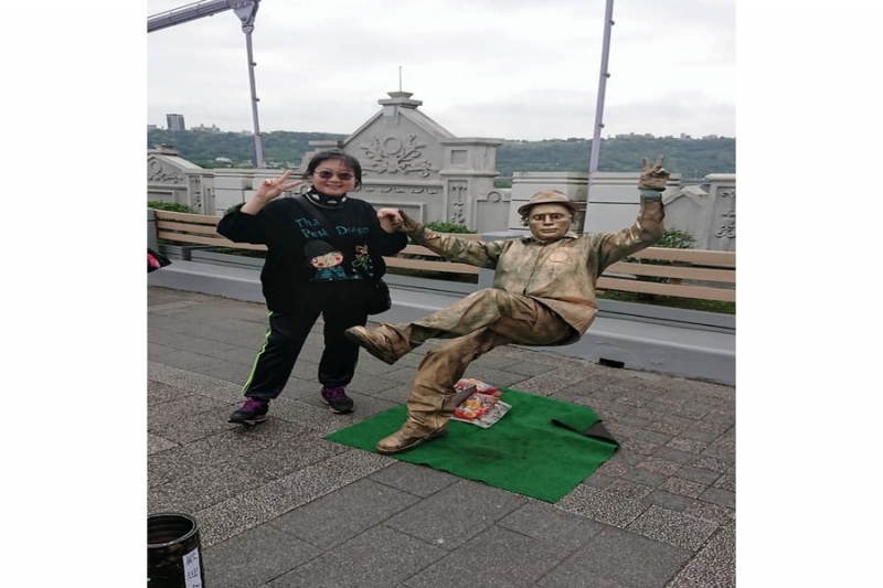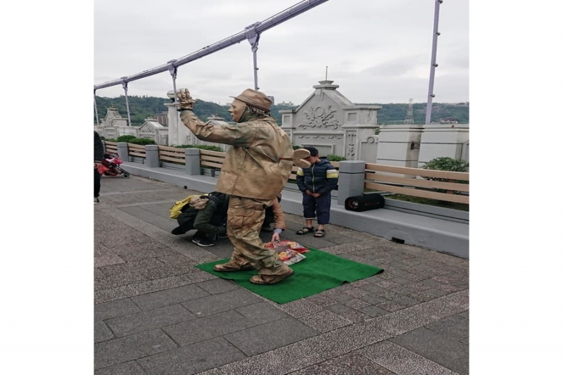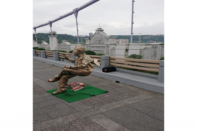 這名「大溪橋小金人」最厲害的是能「憑空坐著」,屁股底下沒任何器具輔助,能坐在半空中,而且還非常地穩固,宛如魔術一般,讓人看了嘖嘖稱奇;他全身塗滿金粉,在民眾投錢後,才會動起來擺POSE跟路人拍照,表演總是相當吸睛。