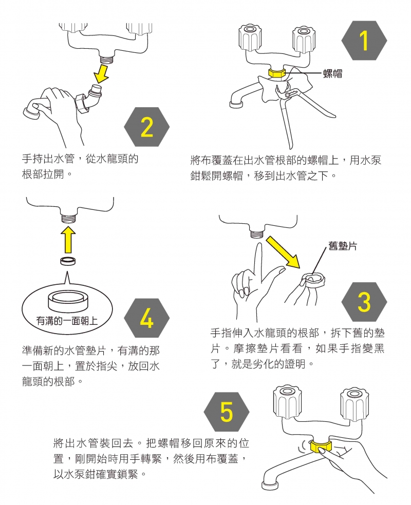 請先檢查出水管看看。如果螺帽鬆了,就鎖緊修復;如果鎖緊了仍然會漏水,就要更換裡面的墊片。