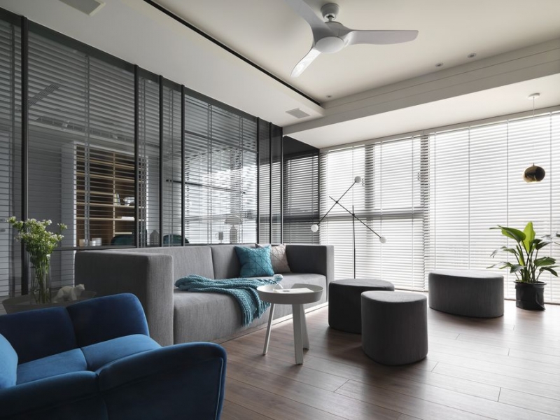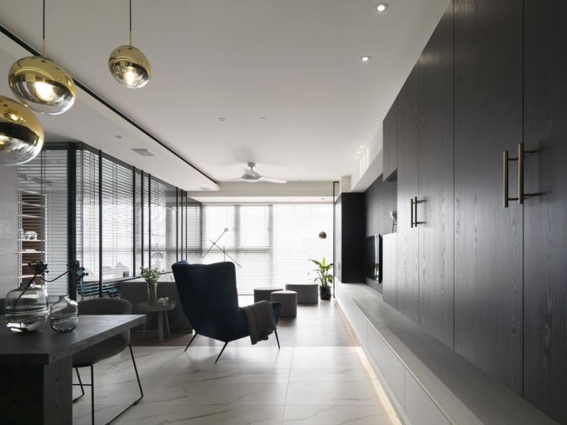 相較之下,立面則改以色澤濃郁的純黑質材鋪展,由入口壁櫃延連而來的電視牆,在起居空間以內嵌型態作為擺設檯面,另外亦擴展側向視覺感受;設計師雙重運用壁櫃與牆體落差形塑外推空間感,搭配深色有利於吸收光線的物理定律,令主牆展現深邃寬廣的畫面感,轉化原先狹長型的場域條件限制。而沙發後方的立面巧妙化用落地清玻搭載百葉簾,讓客廳與書房的戶外日照適時匯聚,為生活自然拂上透亮光感;而鐵建框構出的大小視窗,亦使簡單純淨的清玻璃產生趣味變化,更成為大面積玻璃的安全收邊,完備通透與穩固兼具的視覺印象。