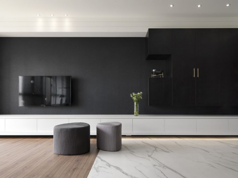 Meier啟發的曾總監,將可見的「白色」及不可見的「留白」融混於同一空間。在作品《黑白融合》中,玄關地坪使用帶有灰紋的白大理石起頭,延展至用餐區域作為動線指引,並與木紋地板對比出鮮明界線,將公領域一分為二,使用餐與起居機能分明立見;天幕則採用簡約手法,除卻出風及吊扇等硬體設備形成的高低起伏,盡可能保留予毫無贅飾的線條語彙,為居住視域劃開大片的純淨天空。