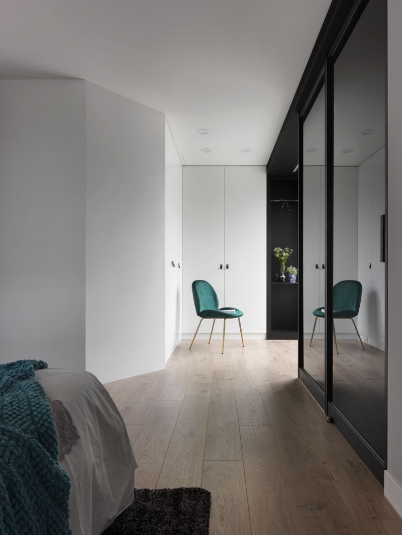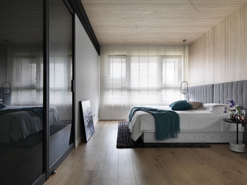藉由純白地坪的指引來到臥室,設計師在房間入口即巧藏心思——將劃分場域的材質拼接線稍微轉向,形成醒目的斜角箭頭,像是暗示量體核心的隱密指路牌。房室全區採用木質地坪奠定溫暖的空間氛圍,臥床上方的天花板更一氣呵成地接續木作手法,使居住者猶如臥於樹洞般倍感安穩。衣櫃則呼應公領域的立面概念,於櫃體門片裝設黑玻,並將如此的色彩意緒延伸至多功能區,化作包容自然景致的雅緻畫框,而邊側空間亦未閒置,規劃為隱而不彰的展品壁龕,讓視覺穿透實體限制,將內外的動靜美景同座收納。而多功能區塊的立面,主要採用純白質材形塑出鮮明的轉折線,當日照拂過,猶如立體感強烈的摺紙作品,藉由折線繫留光影走過的痕跡,為溫馨的睡眠場域優雅收筆。