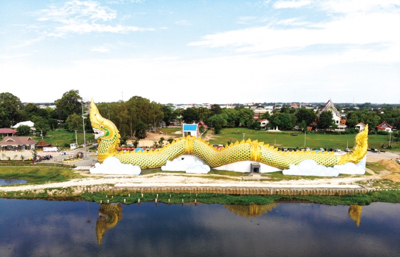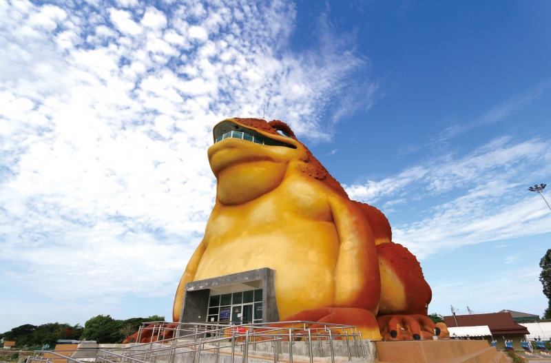 外觀在2018年才大致完成的蟾蜍博物館(พิพิธภัณฑ์พญาคันคาก;Phaya Kankak Museum),截至火箭節當天,內部尚未開放,我們只能在塘壩旁,利用錯位方式與大蟾蜍合照。2019年開放之後,它將是全國唯一的蟾蜍主題館,介紹泰國二十餘種的蟾蜍品種,也會將神話三大天王與火箭節的故事以多媒體展覽的方式呈現。