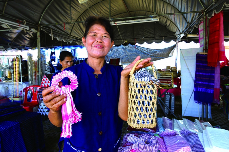 OTOP是One Tambon One Product的縮寫,顧名思義是「一鄉鎮一特產」的商品販售會。益梭通農產品主打「有機」,有機茉莉香米與紅肉西瓜是全泰國知名。香米與西瓜留在益梭通吃就好,適合帶回家的是手工織品,我買了一條藍格子的考麻布(ผ้าขาวม้า;Pha Khao Ma)。