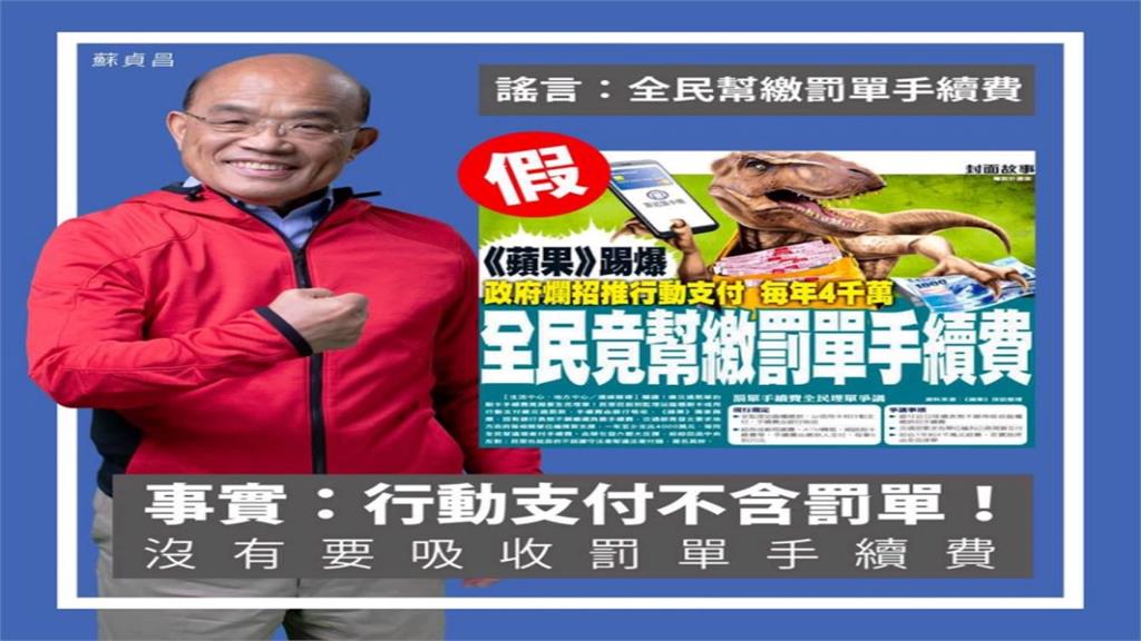 媒體報導後,行政院長蘇貞昌14日在臉書po文,表示「吃飯別吃太多鹽,生活別信太多謠言」,旁邊蓋上大大的「假」字,駁斥假新聞,結果平面媒體出示政院發的公文打臉,表示新北市市政府就曾於今年一月行文中央指出,國發會決議由各公務機關編列預算支付刷卡手續費,此舉將使交通違規罰緩也納入政府代繳手續費範圍,有違使用者付費精神。