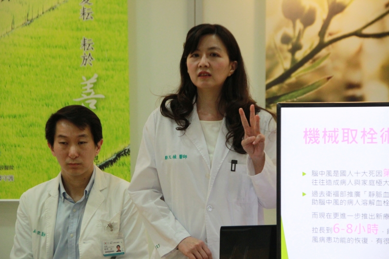 鄭醫師提到,過去衛生福利部推廣「靜脈血栓溶解劑」,在黃金時間三小時內注射,能夠幫助腦中風的病人溶解血栓。而現在更進一步推出新療法「機械取栓術」,集結了急診、神經內科、放射科、麻醉科、技術員等。而顱內動脈非常脆弱,操作時大多需要多位醫師一同進行,但黃金時間可拉長到六到八小時,原理就是將支架與取栓器材,透過導管送入到血栓處,然後將支架撐開包覆住血栓,最後把它拿出來,就像水管不通把毛髮取出一樣的概念。對於中風病患功能的恢復,有更高機率讓病人在三個月後能獨立生活、自主行走。
