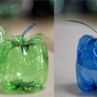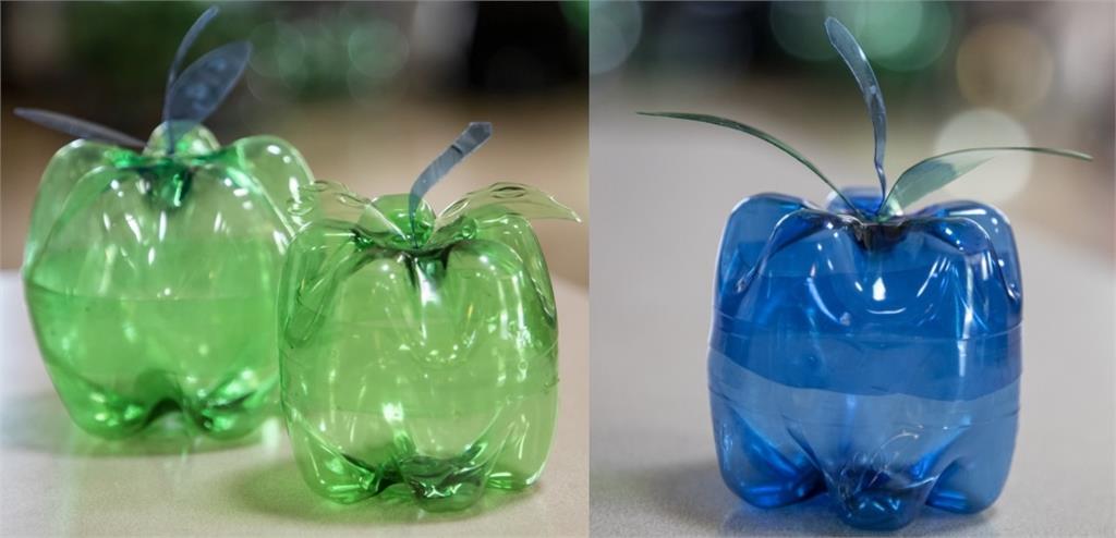 清洗、擦乾、晾乾後,剪出類似蘋果的瓶身,細修後才兩兩套合,接著再剪出葉片黏貼在蘋果上,一顆晶瑩剔透的水晶蘋果誕生了。