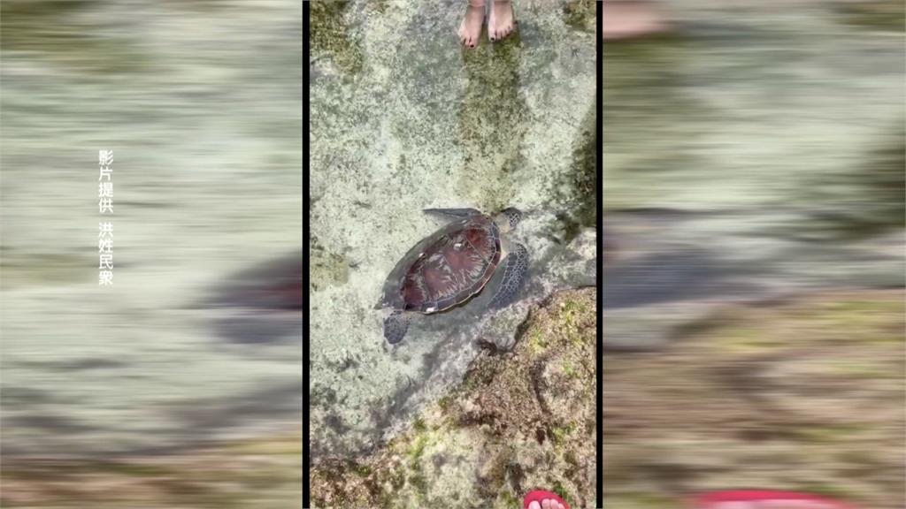 一隻小海龜全身無力的漂浮在岸邊水面,民眾把牠搬到石頭上,卻赫然發現牠的龜殼居然有一個不小的破洞,還不斷噴氣,看了好心疼,而就在牠旁邊還躺在一支藍色魚叉,懷疑遭人刺殺。