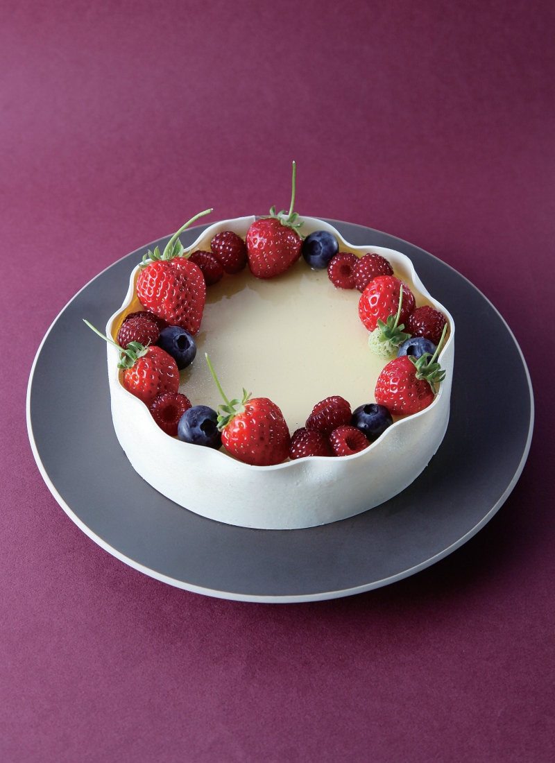 19 拿掉圓形活動蛋糕模後,在起司蛋糕周圍以巧克力裝飾物與水果進行點綴。