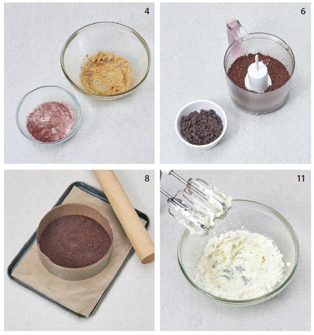 8 將圓形活動蛋糕模鋪上牛油紙或烤盤紙,再倒入奶酥, 壓製成0.8cm 厚的基底蛋糕。