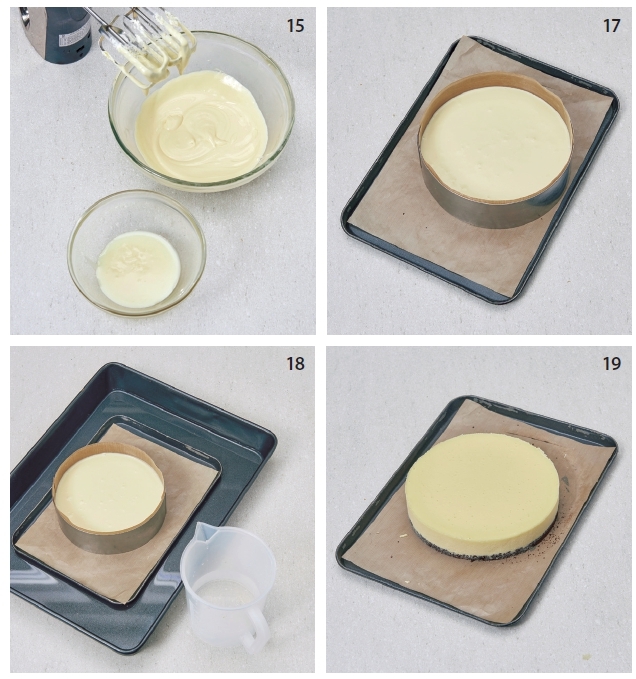 18 放入上火120℃、下火120℃ 的烤箱中,以隔水烘烤的方式烤製55 分鐘。
