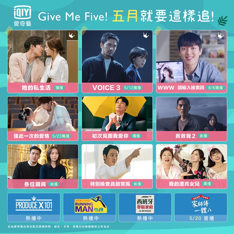 此外,五月除了熱播中的《她的私生活》外,愛奇藝台灣站將自本週陸續推出精彩好戲,如:浪漫輕鬆的愛情喜劇《初次見面我愛你》、《僅此一次的愛情》,懸疑又刺激的《VOICE 3》、《救救我2》等膾炙人口的系列作品,熱愛綜藝的粉絲則有《PRODUCE X101》、《家師傅一體》、《Running Man》及《西班牙寄宿家庭》可選擇。