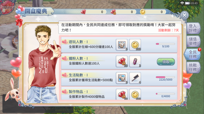 戀愛交友遊戲的魅力就在於玩家間的交流,《戀愛盒子M》當然也為玩家準備了許多全民任務。在開服七天內,各個伺服器玩家只要一起達成任務門檻,就能全服獲得家具、配件箱等好禮!還不快呼朋喚友下載遊戲,完成任務拿獎勵!