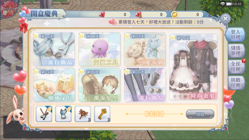 為了迎接公測,《戀愛盒子M》也準備了許多開服好康。在開服七天內,每天登入都能領取許多實用虛寶,除了飾品、交通工具,以及大家都搶著要的髮型和家具之外,只要七天全勤登入,還能拿到夢幻時尚套裝。