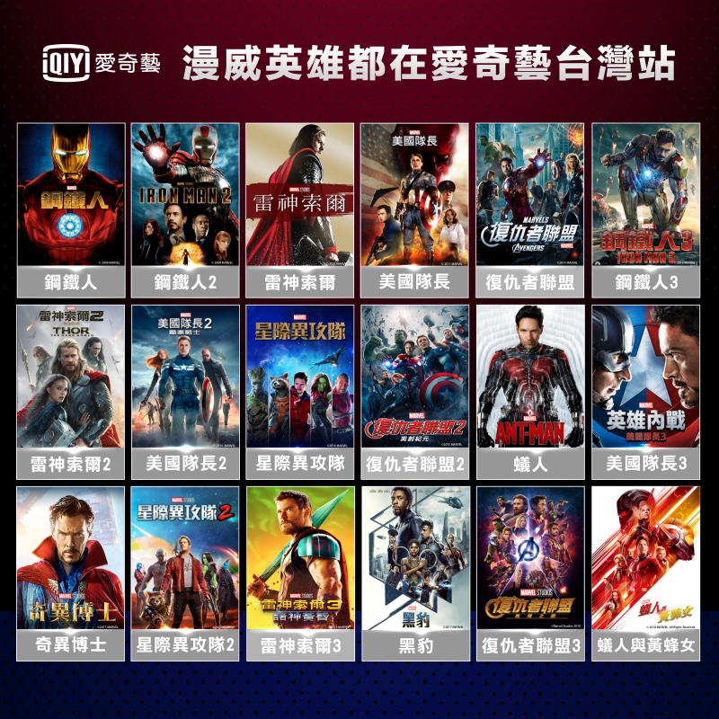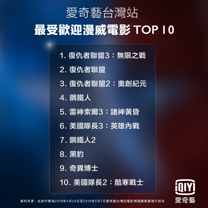 在《復仇者聯盟4:終局之戰》上映後,周邊效應大發威!用戶除紛紛湧入愛奇藝台灣站複習漫威電影,也帶動站內漫威電影系列成長200%(2019/3/14-2019/5/7)。觀察下來,愛奇藝台灣站內最受歡迎漫威電影,前三名由復仇者聯盟系列包辦,4-6名則分別由最受歡迎的超級英雄:鋼鐵人、雷神索爾、美國隊長佔據。