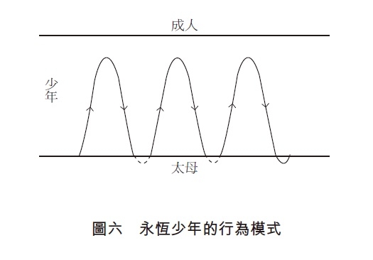 他們(永恆少年們)雖然顯示出適應社會的困難,但因為不願委屈自己那特別的才能,所以自我解釋認為沒有必要去適應社會,將這一切歸咎於沒有辦法容納他們的社會的錯。他們還沒有到需要認真思考的時候,還沒有找到真正要什麼,總之就是經常處於「還沒有」的狀態。但某一天,這少年會突然積極起來,可能會突然發表偉大的藝術作品,或者為了解救全人類而站起來。這時表現出的敏銳性和強大的力量會讓許多人為之讚嘆,但很可惜的是其中一個特徵就是沒有持久性。因為他們這時會不畏危險,所以讓人以為他們很勇敢,但在真實的背後,他們其實想回歸到太母的子宮裡,會一直抱持著這種願望直到死亡。