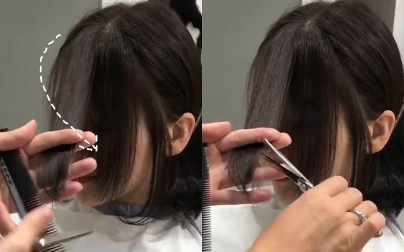 接著修剪時,記得將瀏海往反方向拉出,也就是說分線右邊的瀏海要往左邊拉、分線左邊的瀏海要往右邊拉喔!