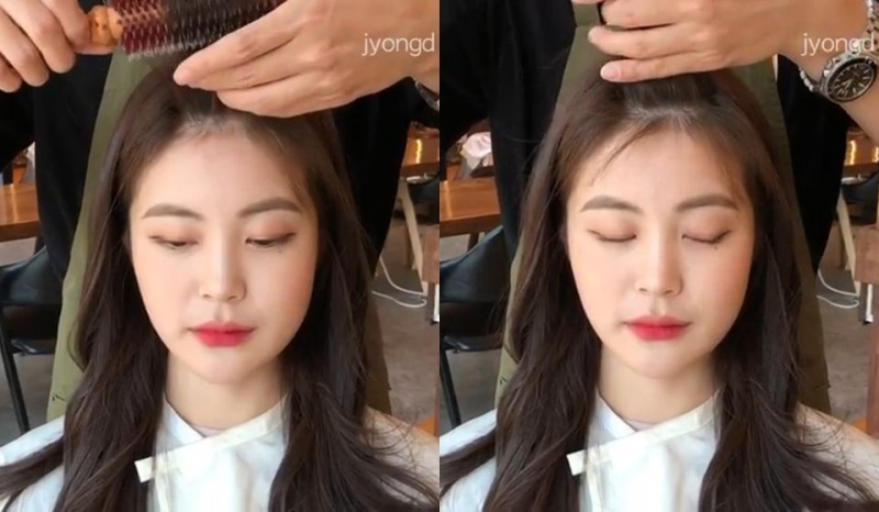 之前也介紹過的瀏海正確使用方式也有提到,瀏海髮捲、或是這邊髮型師用的圓梳,一定要先將頭髮往上、再把髮捲或圓梳由上往下捲起,這樣髮根才會蓬鬆。