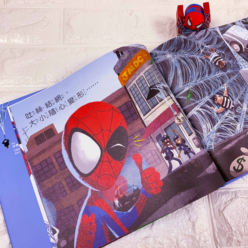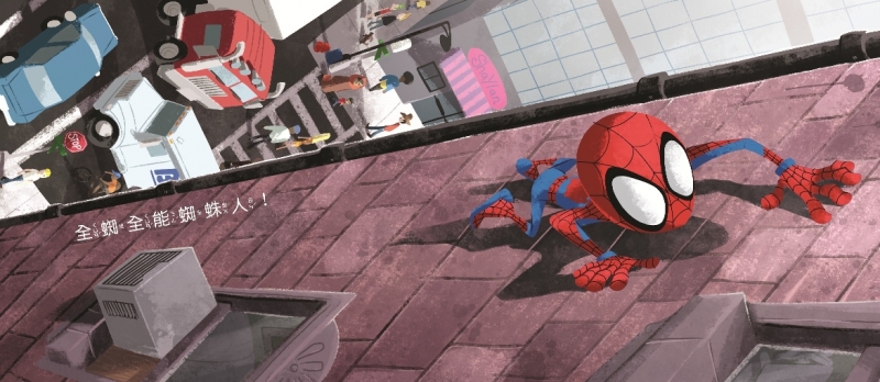《蜘蛛人,蜘蛛人,全蜘全能蜘蛛人!》以1960年傳唱至今的蜘蛛人主題曲歌詞串穿全書,讓讀者可以一面唱著「Spider-man, Spider-man…」一面跟著繪本內容探索「社區型超級英雄」蜘蛛人的一天。書中不僅可以看到飛簷走壁與蜘蛛絲網住汽車的名場面,連瑪莉珍、毒蠍人、綠惡魔等經典角色也來參一腳,看手腳俐落的彼得‧帕克如何敦親睦鄰,保護市民不受壞蛋侵襲。超適合漫威粉父母使用的床邊繪本於焉誕生!