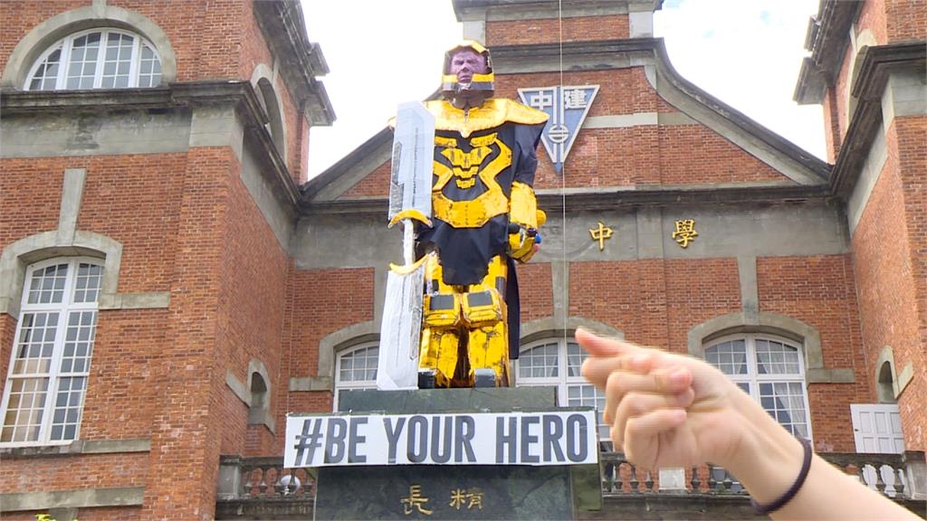 薩諾斯來了,建中校園蔣公銅像72變。參考電影《復仇者聯盟》,化身漫威電影反派薩諾斯,建中蔣公銅像穿上黑金色盔甲,手裡拿著武器,就連臉也塗上紫色,但這KUSO蔣公銅像的行為,卻接到民眾投訴。
