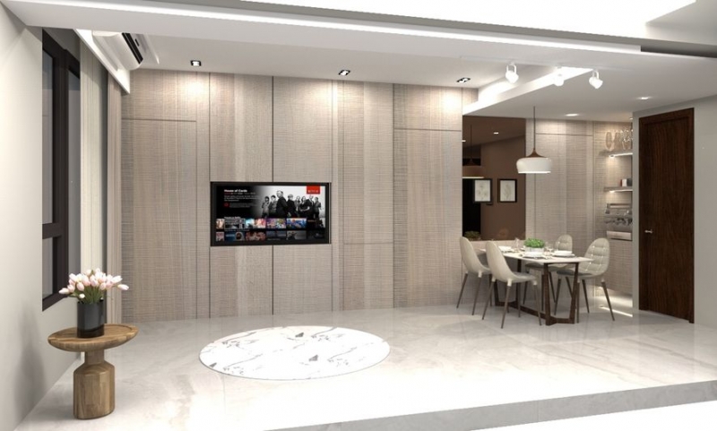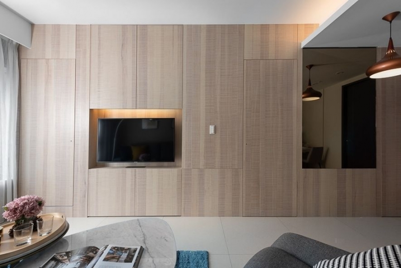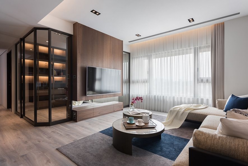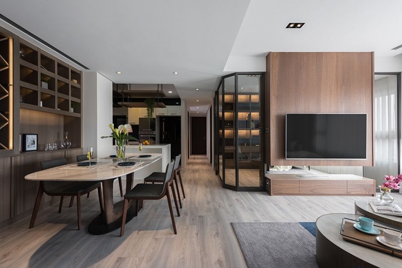 在住家作品《霽月集》中,總監考量業主期望除去色彩紛擾,設計之初便採用低明度色系為主調,以純白天地搭配淺木色電視牆,形塑清雅的生活氛圍,進而將天幕雕塑出高低落差,精確劃分客餐廳場域。仔細觀察連結兩區的電視牆,不難發現其上的隱藏櫃、兩扇暗門、茶鏡與天花板皆採取相同比例設計,並賦予門縫及分割縫更多的造型意義,將整面電視牆的各種元素精巧地安排,達到細膩的畫面效果。