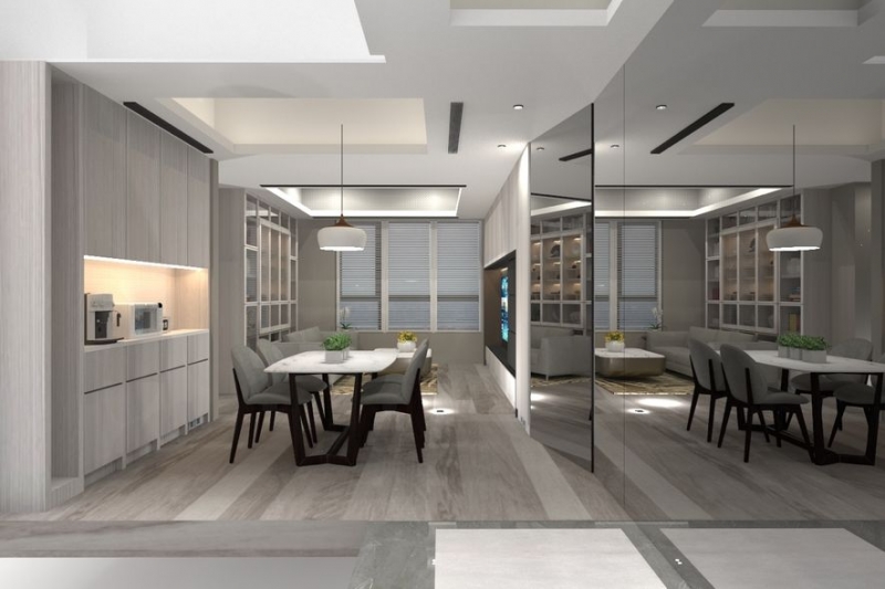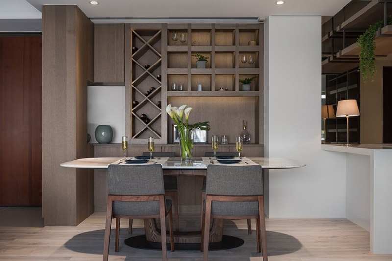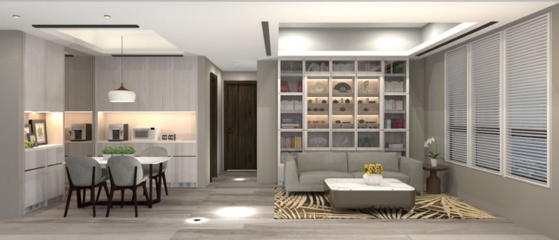 最後總監舉出橫掃各大獎項的常勝作品《沉穩之間》,模擬圖中大幅使用沉穩木質搭構立面及地坪,與刻意留白的櫃體形成強烈的視覺風格,隱居背景的天花板則採用局部挑空手法,除了作為場域的虛實分界以外,亦成為容納反照日光的絕佳設計;其下的電視牆及玻璃隔間,分別利用部分鏤空及清透材質,建構綿延視野;而預設與客廳相鄰的用餐區中,別具巧思的壁櫃具備多種尺寸及排列方式,滿足業主展示酒品及陳列家飾的需求。當我們把設計圖與實景照兩相對照,除卻後來部份的色調調整,其餘部分則高度還原設計圖,使優雅穩重的內斂氣質完整地發散。