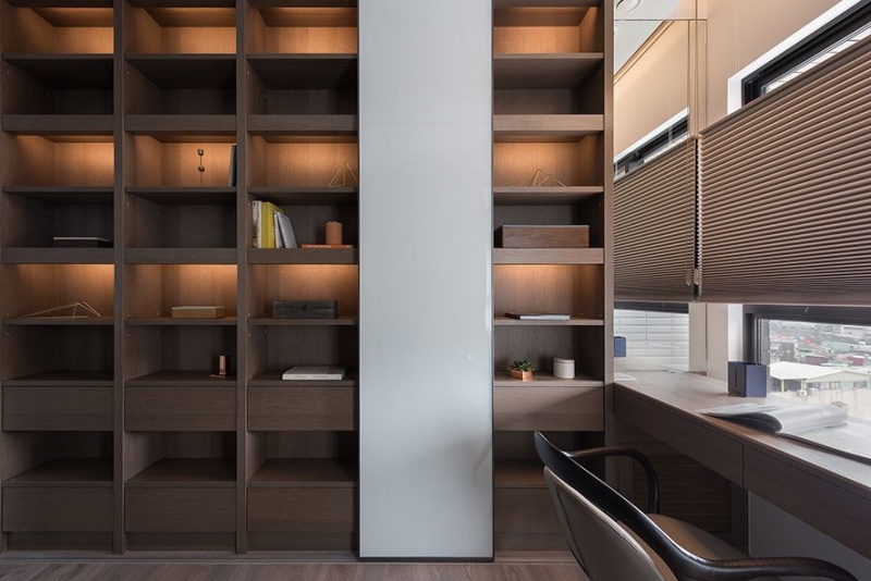(圖)塘采設計 作品《沉穩之間》實景中重要的視覺主牆,透過清玻隔間,將書房內的壁櫃樣式一體呈顯為穩重的入門意象。