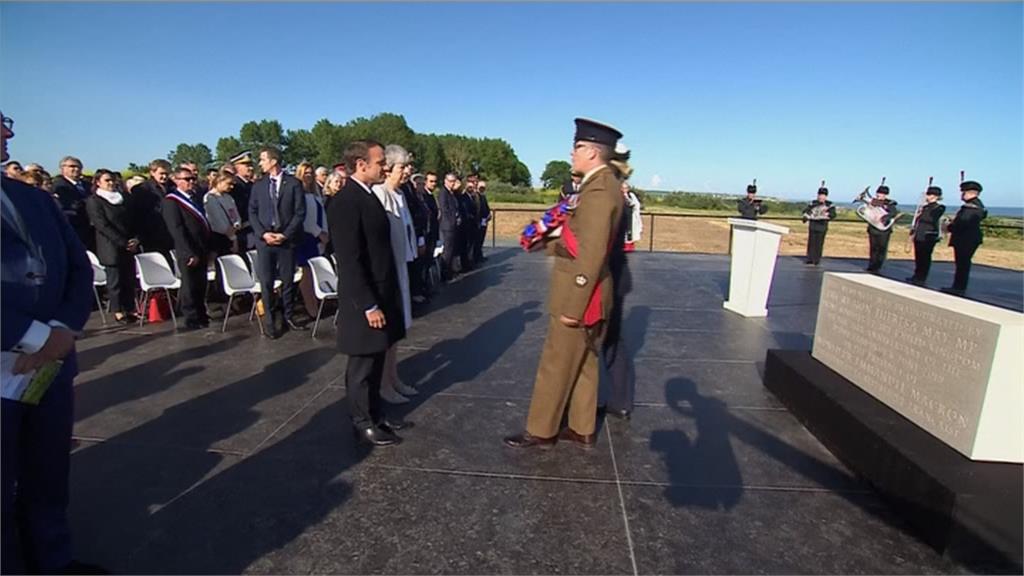 號角聲中,太陽從海平面上冉冉升起。35名美軍二戰退役美軍及數百民眾,聚集在法國奧馬哈海灘,紀念75年前6月6日清晨6點30分,第一名盟軍士兵搶灘登陸。而另一頭黃金海灘上,法國總統馬克宏與英國首相梅伊,共同為當年戰役中身亡的將士獻花,默哀致敬。
