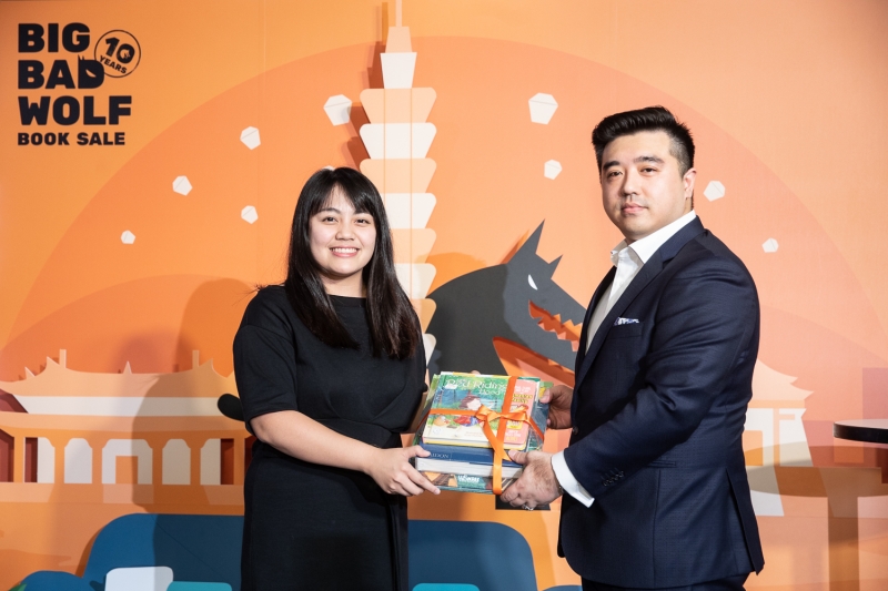 ▲ 2019台北大野狼國際書展台灣負責人黃翊軒代表捐贈700本書給Teach for Taiwan「為台灣而教」代表人樂冷•羅法妮奧,共同開啟小紅帽慈善閱讀推廣計畫。